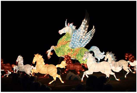 馬年看馬燈,主燈“龍馬騰霄”為燈展之最,高達22米;展現武漢特色的巨型燈組“熱干面”設計新穎,制作精美,引人遐思。