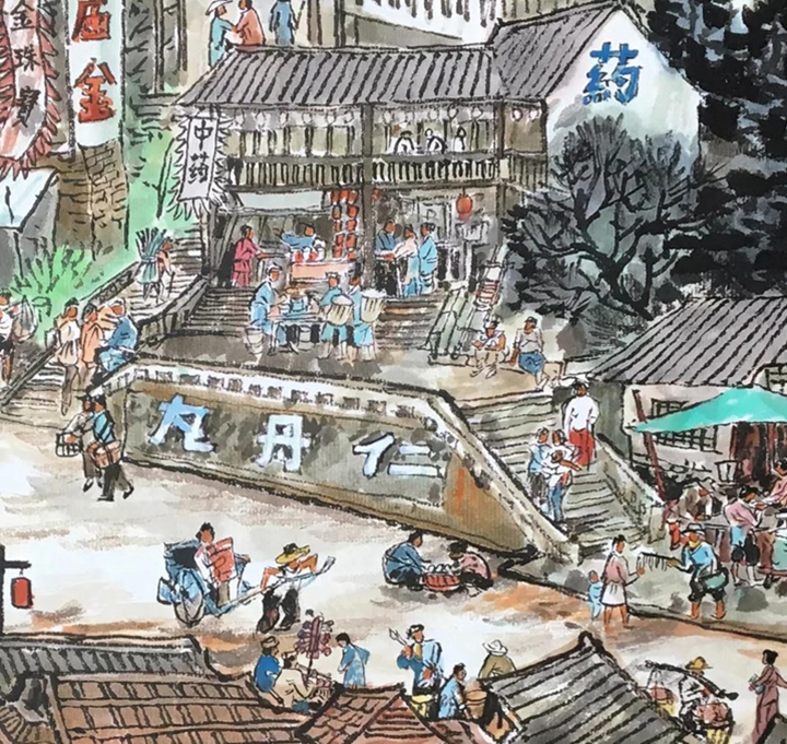 當年主要的醫療依靠中藥房,包括看病門診與生產膏藥的藥房等等。圖中藥房前面的廣告、轎夫、三輪車夫、看病的各種人,上百人圍繞醫院轉,成為畫面中一處小聚集。