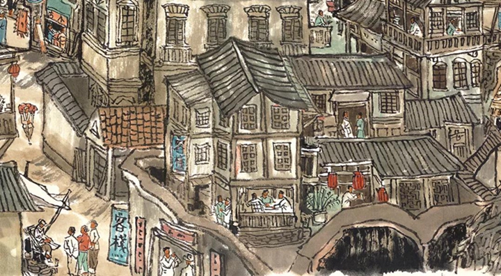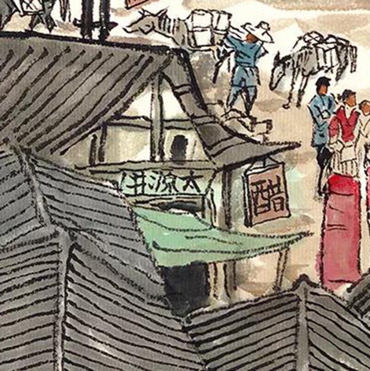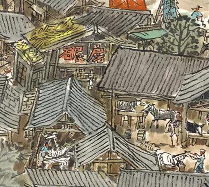 當時自流井著名的鹽商曾被稱作河東王、河西李。而河西李即李四友堂就在下牌坊處,今天已經人去樓空沒有一點遺跡。畫家找到一位90歲的老太太,靠老人記憶中的樣子,畫出了下牌坊及李家院子,畫出來后老人家又提出了許多修改意見,最終認可了如今畫中的樣子。