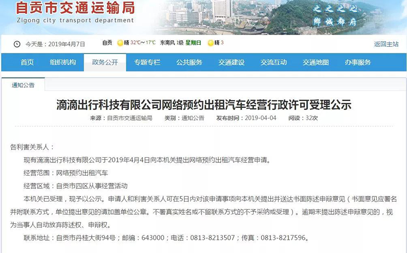 自貢市交通運輸局提出網絡預約出租汽車經營申請后