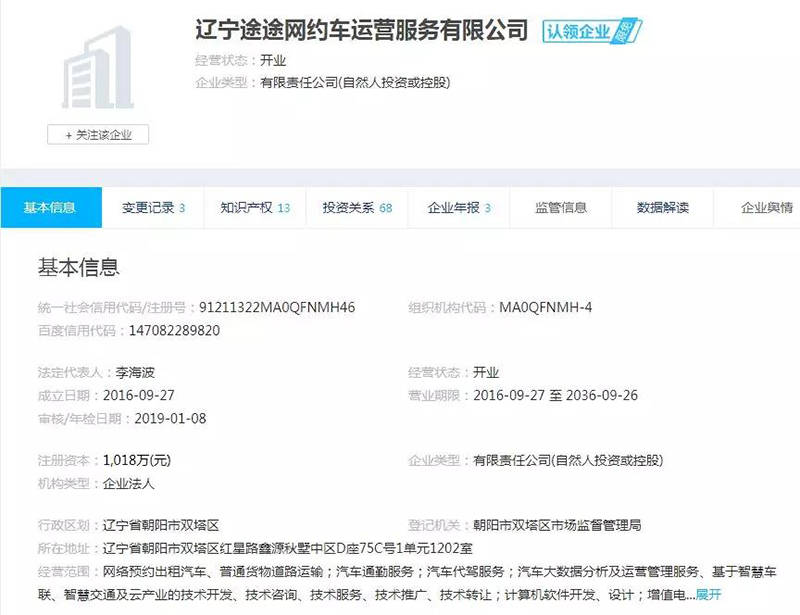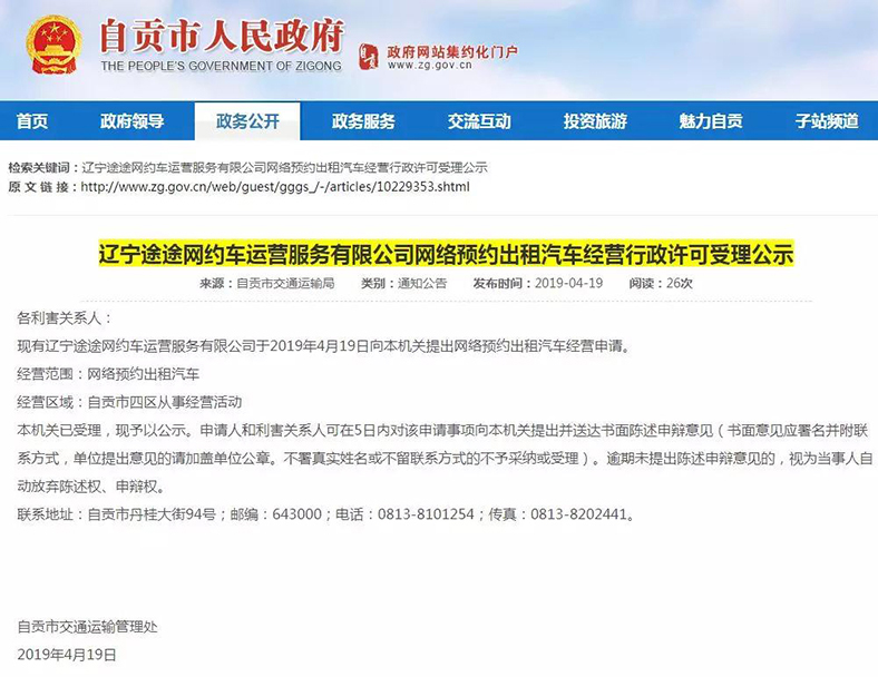 現有遼寧途途網約車運營服務有限公司于2019年4月19日向本機關提出網絡預約出租汽車經營申請。