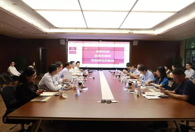 2019年7月8日,宜賓市委常委、統(tǒng)戰(zhàn)部部長李學(xué)焦、宜賓市經(jīng)濟(jì)合作和外事局副局長王超、宜賓市經(jīng)濟(jì)發(fā)展服務(wù)中心副主任竇宇航、宜賓市房地產(chǎn)管理局副局長袁永靜、宜賓市經(jīng)濟(jì)合作和外事局廣東分局副局長孟明強一行到訪碧桂園集團(tuán)總部考察交流并召開座談會。